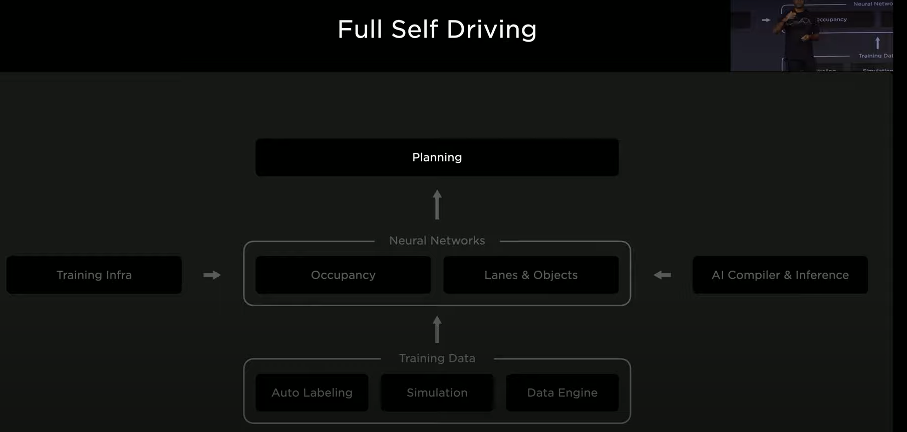 All the technology starts with the camera streams, that run through their neural networks and it all comes to the car. It is the car itself that produces all the outputs for self-driving. The planning software drives the car and makes sense of all the outputs of the neural networks.