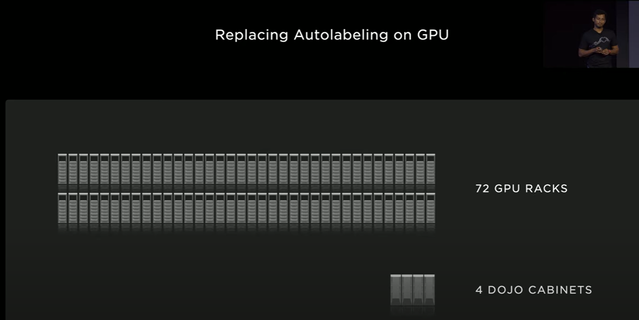 Tesla expects to replace 72 GPU racks with over 4k GPUs with just 4 Dojo cabinets and provide the same throughput and performance. Those will be available in Q1 2023 and will be part of the 1st Exapod. This will more than double Tesla's Auto Labeling capacity. This first one is part of a set of 7 exapods that will be built in Palo Alto
