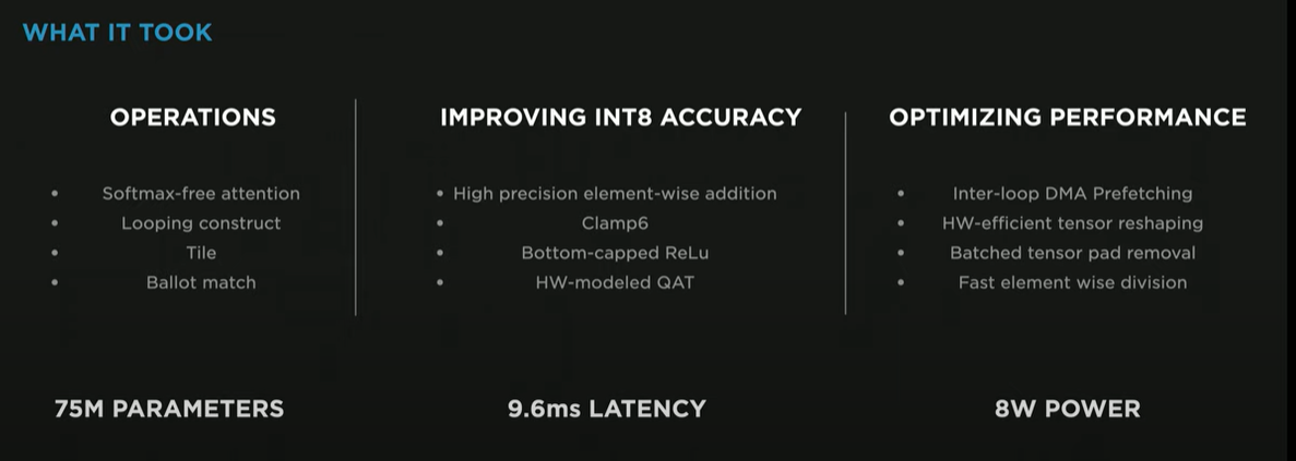 Every millisecond really matters to be able to react when we are driving. Tesla engineers presented how they optimize neural networks to minimize latency. The example showed was for the FSD Lanes Network in the Car. All those networks run directly in the TRIP engine, which is the Neural Network accelerator that runs in the car. Within the car, there are several networks such as Moving Object Network, Occupancy Network, Traffic Controls & Road Sign Network, and Path Planning Network. To give a sense of scale, all that combined is 1B Parameters combined producing 1k Neural Network Signals.