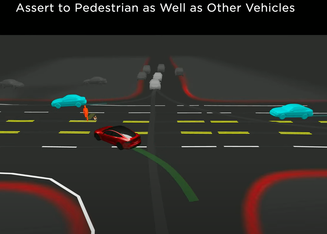 The demonstration showed how Tesla Autopilot deals with an intersection where a pedestrian is crossing unexpectedly without a crosswalk. Humans are good at looking at a scene, understanding all the object interactions, evaluating the most promising ones, and generally making good decisions. In this case, there are several approaches that the car could take and the evaluation of all those interactions are not trivial.